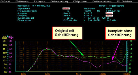Bei der anschließenden Kontrollmessung wurde schnell klar, daß die fehlende Schallführung an einem der Chassis nicht nur optisch störte. Der kleine Trichter und das sternförmige Element über der Membran beeinflussen die Wiedergabe im Frequenzbereich zwischen 5000 und ca. 15.000Hz ganz entscheidend. Ein gewisser Effekt war selbstverständlich zu erwarten, aber es fehlen hier breitbandig ungefähr 6dB Schalldruck.
