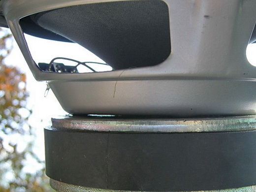 Der Korb dieses Lautsprechers war an mehreren Stellen verzogen. Der Rand hatte einen "Achter" und der schwere Magnet stand schräg, so daß die Schwingspule eingeklemmt wurde.