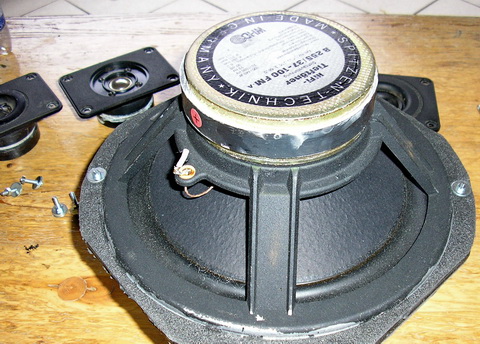 Die sechs Chassis, zwei 250er Bässe mit Gußkorb, zwei 38er Gewebekalotten und zwei Hochtöner mit Titanmembran, waren einmal ein Bausatz aus dem Spitzenklasse-Segment. Sie wurden einige Zeit unter schlechten Bedingungen gelagert und zeigten viele Spuren von Korrosion, eine Mitteltonkalotte machte kratzende Geräusche.