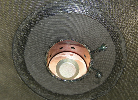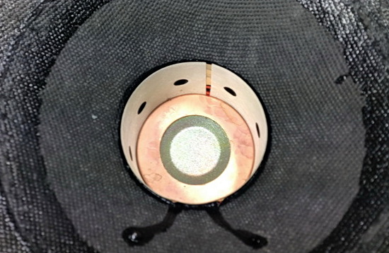 Die Ursache des Ausfalls war nach Entfernen der großen Staubkalotte nur zu ahnen: Die Schwingspulenwicklung hatte eine kleine Lücke und der Spulenträger klemmte etwas im Luftspalt.